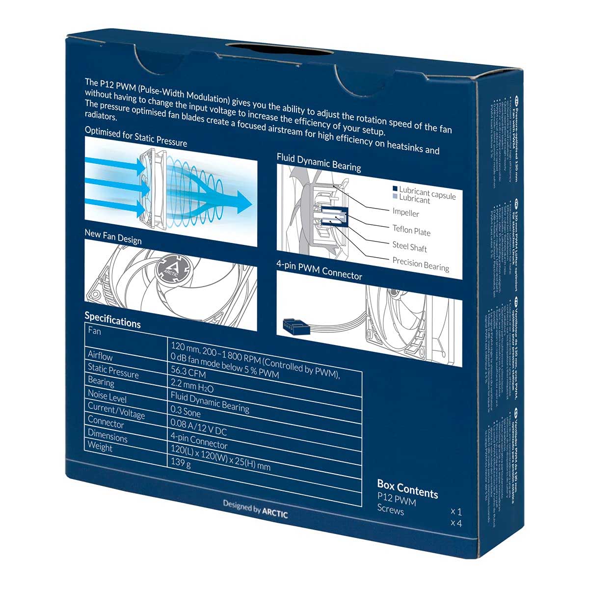- ARCTIC launches their new CPU RGB Case Fan with P12 PWM Black 120mm Fan. The PWM controlled fan is designed to work with speed between 200 - 1800rpm at a low sound level 0.3 Sone.