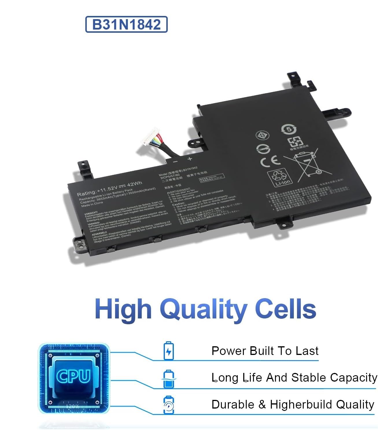 Using a poor battery with unstable performance may do harm to the notebook and your safety. Our Asus B31N1842 replacement battery has passed CE, UL, ROHS, and other international authority certifications, which provides a variety of protection functions, effectively preventing common risks such as short circuits, overheating, and overvoltage. In order to protect your laptop and your safety, please rest assured to purchase our high-quality batteries!