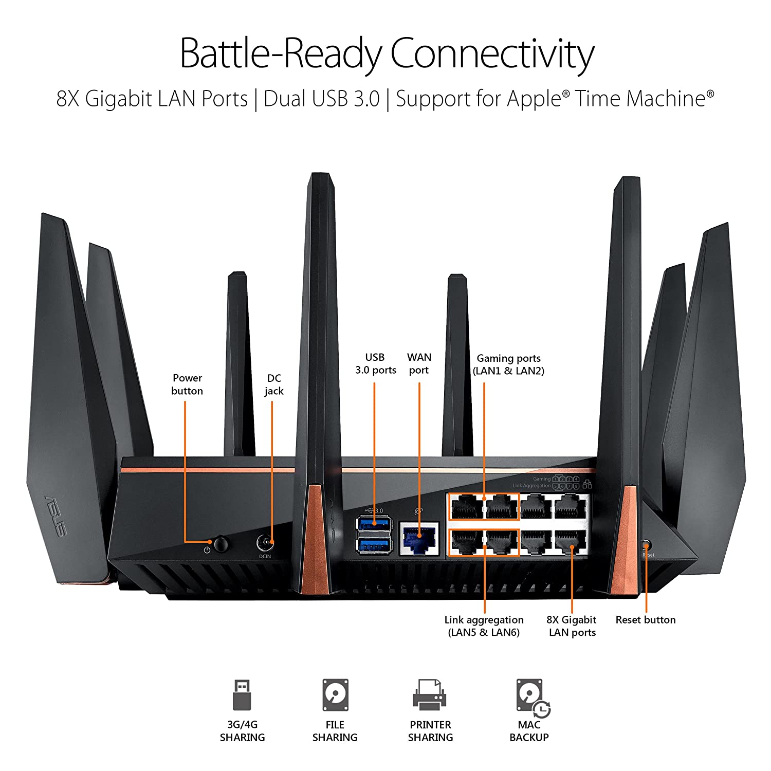 - Battle-ready hardware like game-winning tri-band 802.11ac Wi-Fi, with 8 x Gigabit LAN ports for wired devices and 2 x ultra-fast USB 3.0 ports.