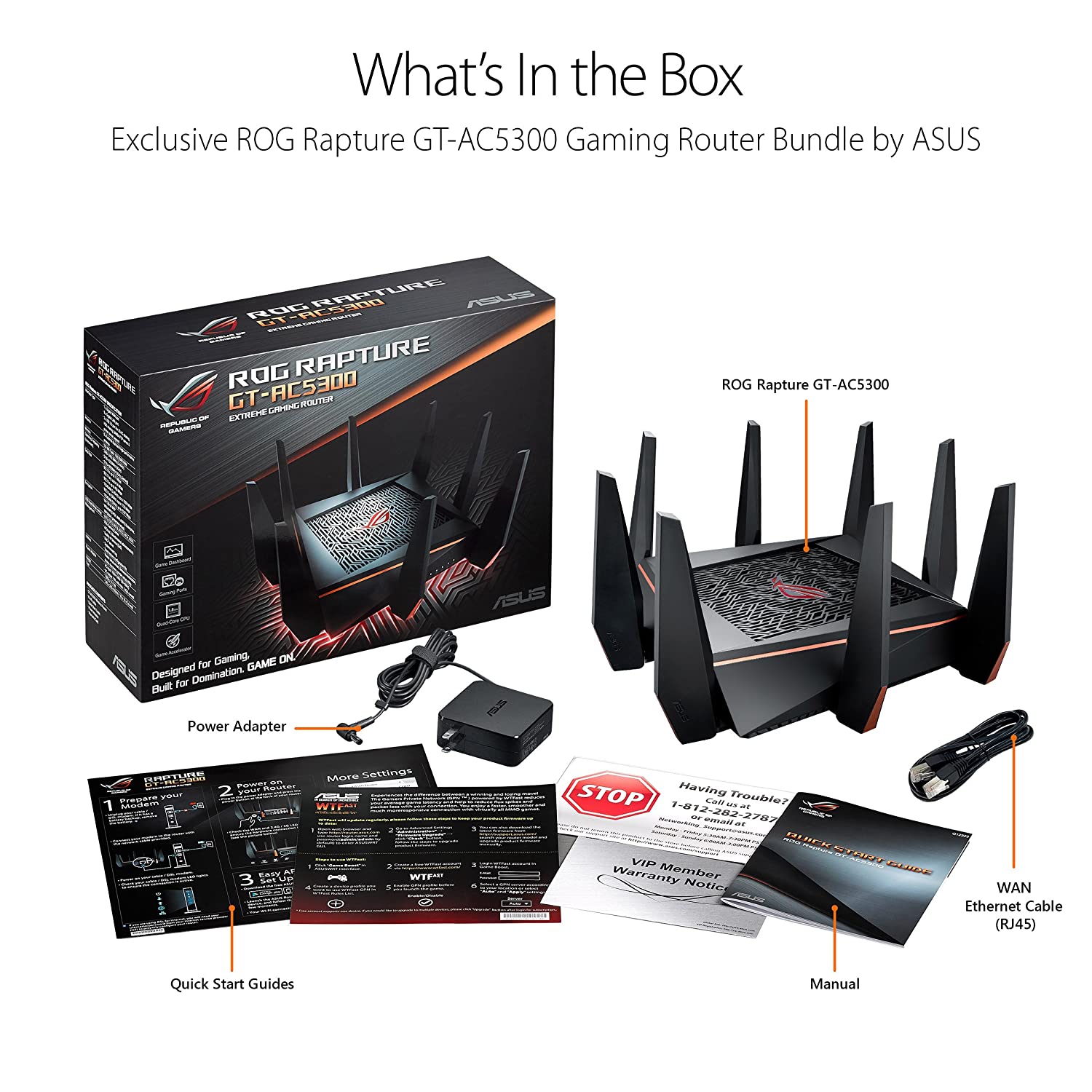 ASUS GT-AC5300 ROG Rapture Tri-band WiFi Gaming router for VR and 4K streaming, with a quad-core processor, gaming port, WTFast, Adaptive QoS, and AiProtection network security. GT-AC5300 comes with front line Network security, 8 gigabit LAN port, and 2 USB 3.0 port.