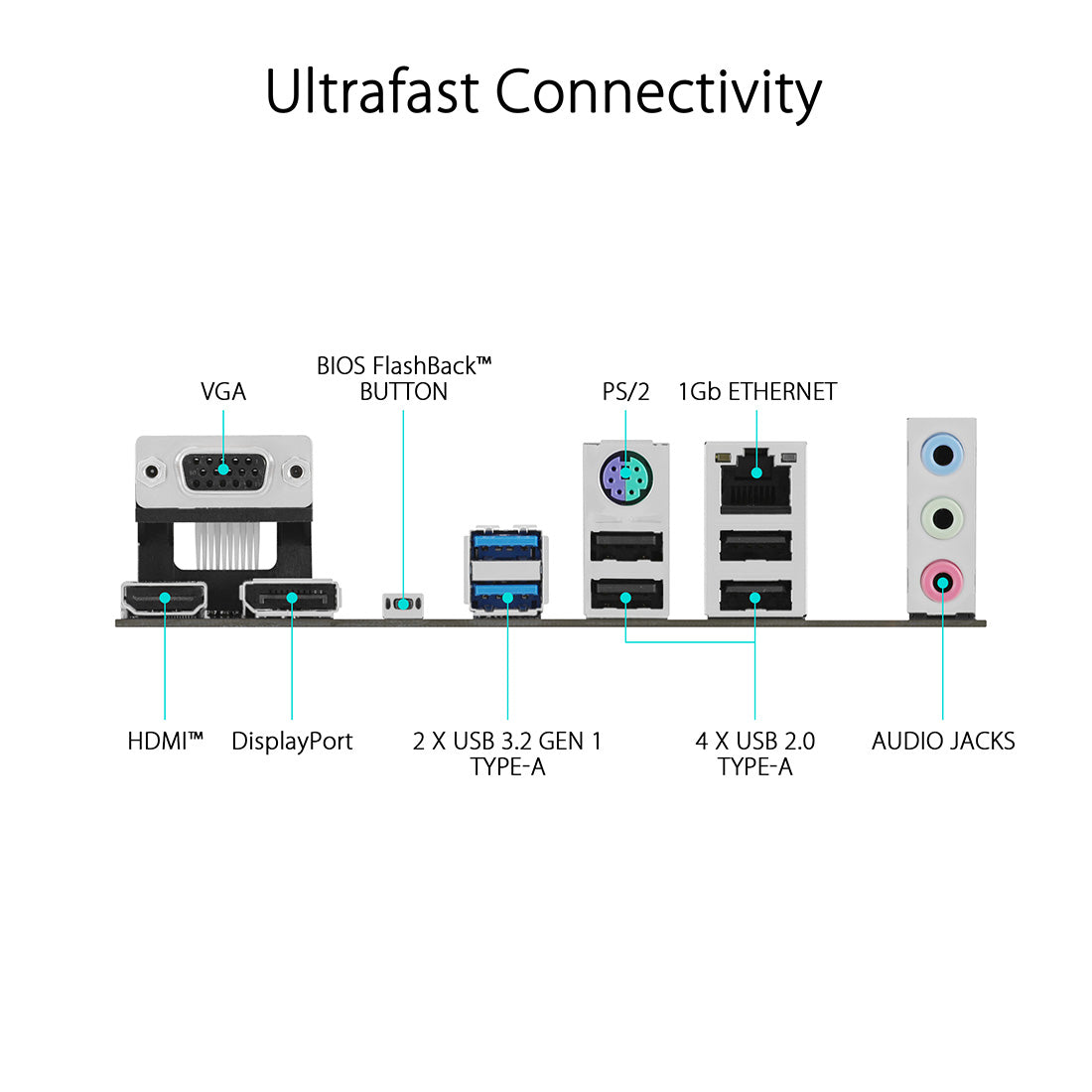 | Back Panel I/O Ports | 2 x USB 3.2 Gen 1 (5G) ports (2 x Type-A) 4 x USB 2.0 ports (4 x Type-A) 1 x DisplayPort 1 x HDMI port 1 x VGA port 1 x Realtek 2.5Gb Ethernet port 3 x Audio jacks 1 x BIOS FlashBack button 1 x PS/2 Keyboard/Mouse combo port |