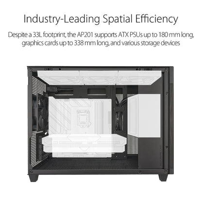 Despite its compact size, the AP201 supports standard ATX power supplies up to 180 mm long, graphics cards up to 338 mm long, custom liquid cooling setups, and a spread of storage devices.