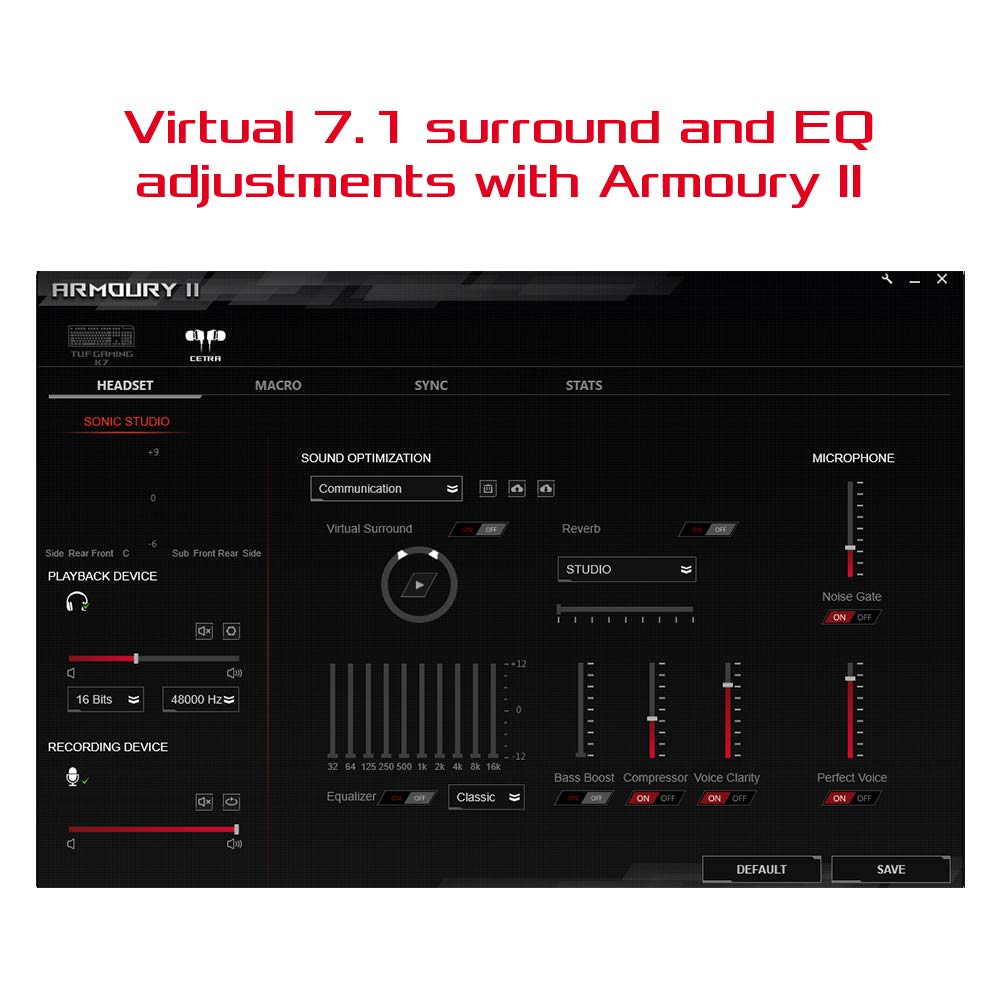 - Armoury II software offers extensive controls and an intuitive UI, so you can easily tune ROG Cetra to play your way. Take full control of your audio experience, from equalization (EQ) to 7.1-speaker level-balancing, and easily create and apply audio profiles for different game types and scenarios, such as first-person shooters and racing titles.
