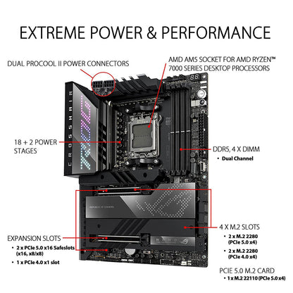 Unyielding power delivery and robust thermal management form the indelible tenets of its creed. Hyperspeed connectivity, comprehensive PCIE 5.0 and DDR5 support and the finishing touches are added by exclusive utilities and overclocking controls that allow you to uniquely flex the performance of Ryzen 7000 Series processors.