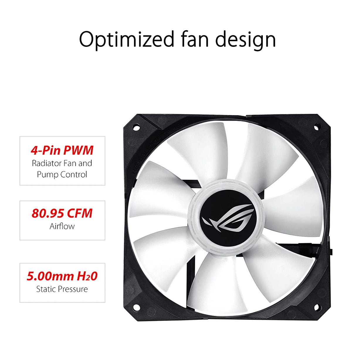 The ROG radiator fan is specifically tuned to deliver optimum performance with Rog Strix LC RGB series radiators, generating 81CFM/5.0mm H2O for superior cooling efficiency with seriously striking RGB visual effects.