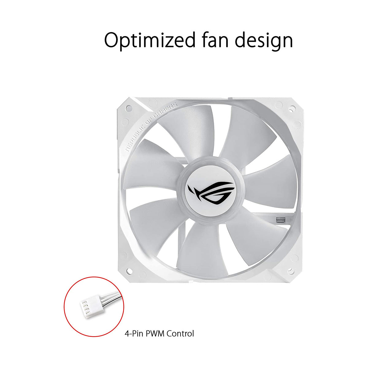 The ROG radiator fan is specifically tuned to deliver optimum performance with ROG Strix LC White Edition series radiators, generating 81CFM/5.0mm H2O for superior cooling efficiency.