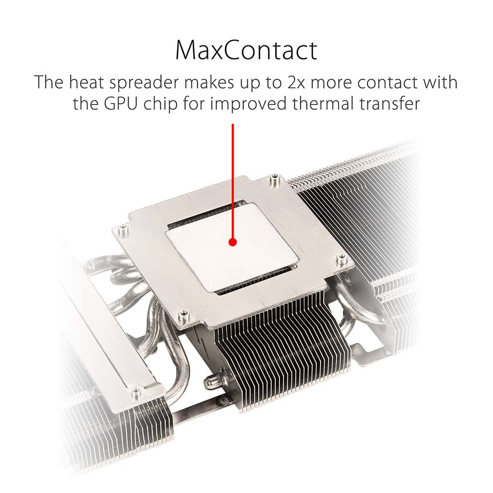 The heat spreader draws heat up into heatpipes that carry it through a fin stack that fills most of the card’s large, 2.7-slot footprint.