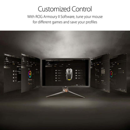 Asus Aura Sync RGB lighting features a nearly endless spectrum of colors with the ability to synchronize effects across the Ecosystem of AURA Sync enabled TUF Gaming products. Rog Armory II software for easy customization of buttons, profiles, and adjusting performance or lighting settings.