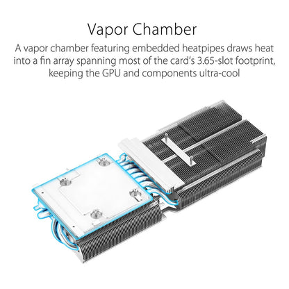 A vapor chamber featuring milled pathways lets the heatpipes sink in without being pressed flat, allowing heat to be carried more efficiently to the fin stack. This reduces GPU temperature by up to 5 Celsius when subjected to a 500W thermal load.