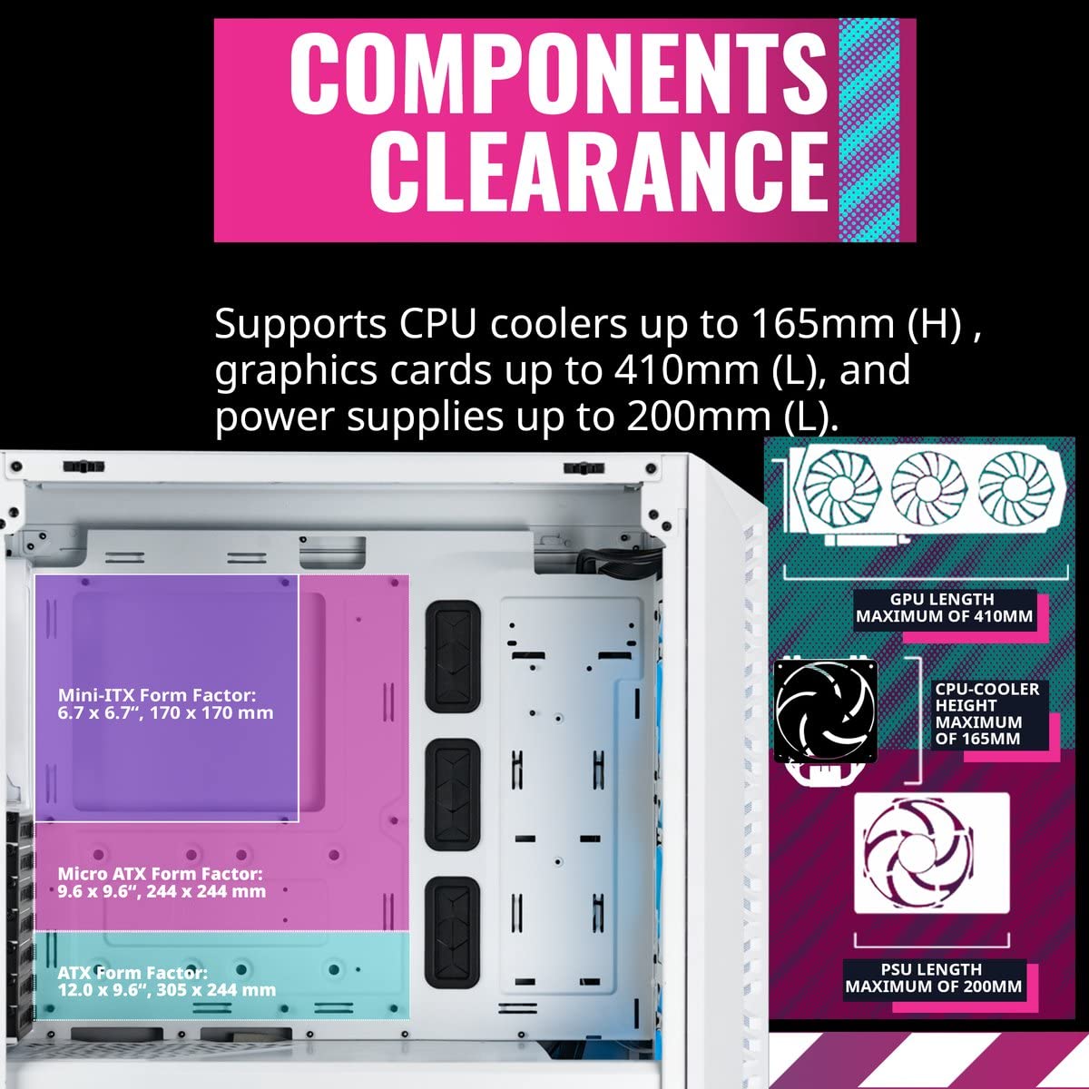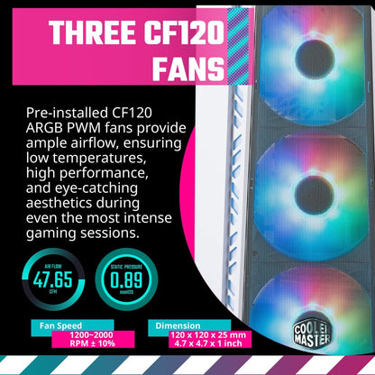 Pre-installed CF120 ARGB fans provide ample airflow, ensuring low temperatures, high performance, and eye-catching aesthetics during even the most intense gaming sessions.
