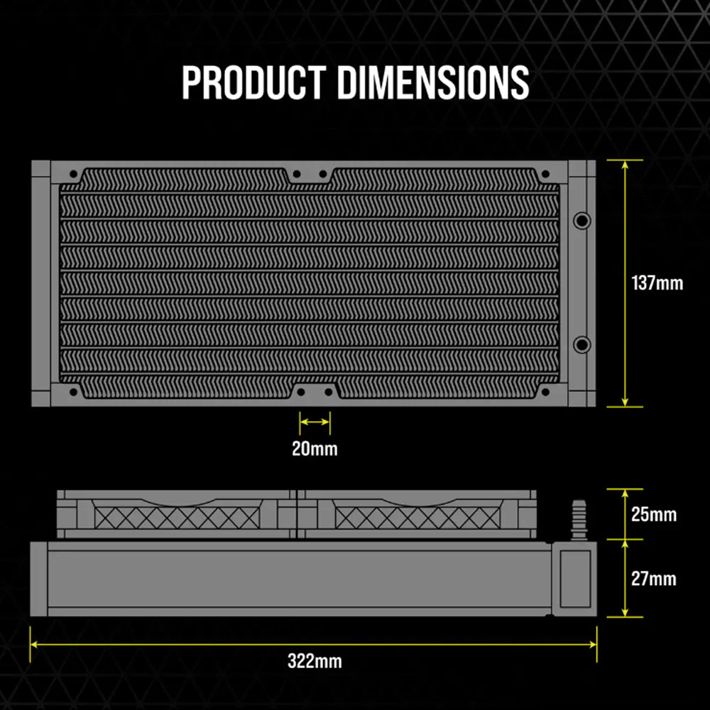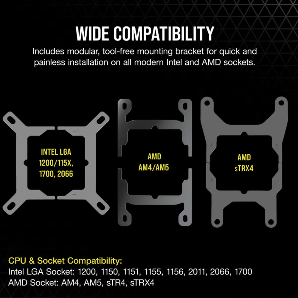 • The CORSAIR 280mm liquid cooler for CPU is designed to be compatible with both Intel and AMD Sockets including LGA 1700, 1200, 1150, 1151, 1155, 1156, 1366, 2011, 2066 and AMD AM5, AM4, sTRX4, sTR4.