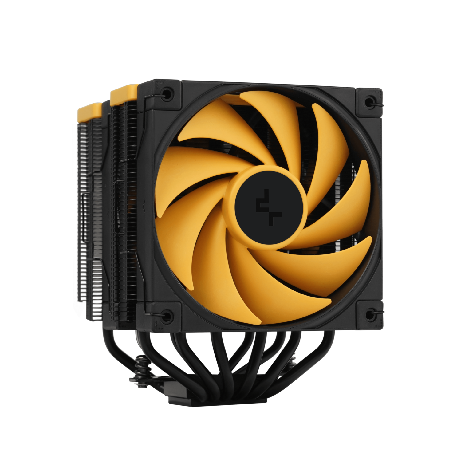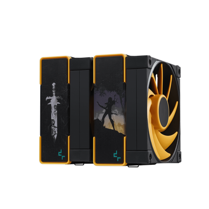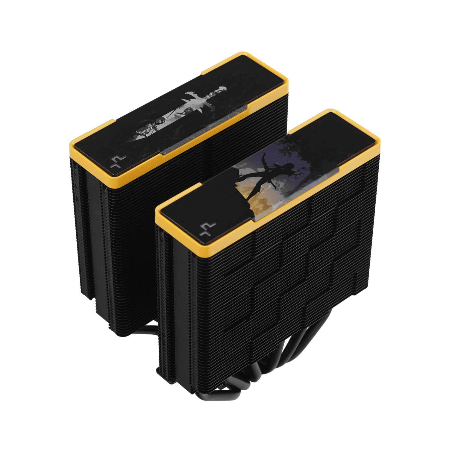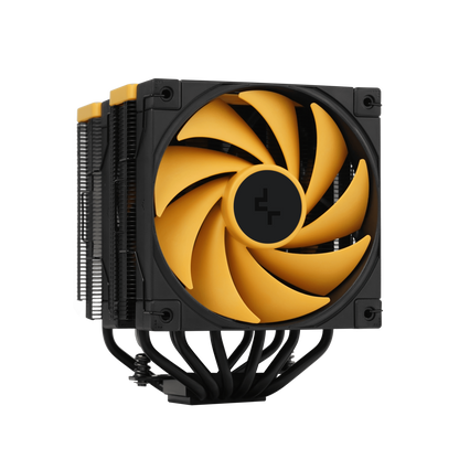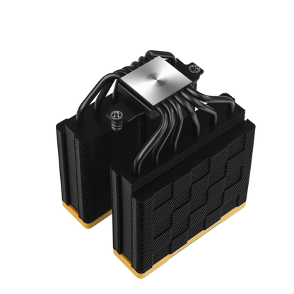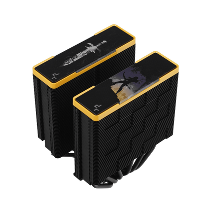 The same premium-quality materials, featuring six advanced copper heat pipes, a pure copper coldplate, a dense dual-tower heat sink, and two silent FDB fans, produce a powerful winning formula for high-performance cooling in a raven black and yellow aesthetic.