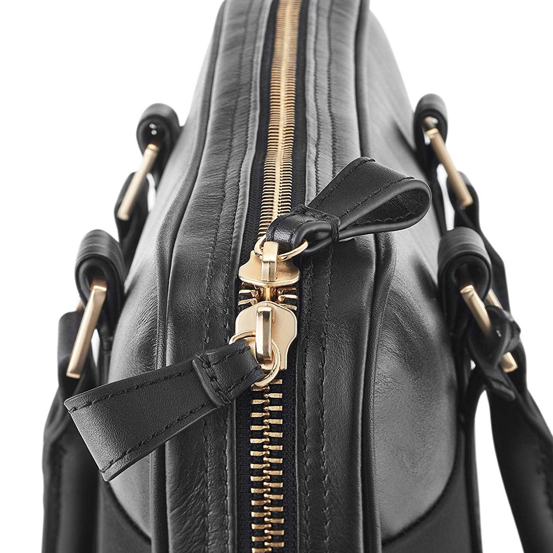 - Elegant split-leather material and nylon twill surrounds your laptop with a luxurious style. Fits up to 14-inch laptops.