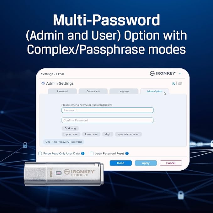 Multi-Password Option: Supports both Admin and User passwords with complex and passphrase modes for enhanced security.