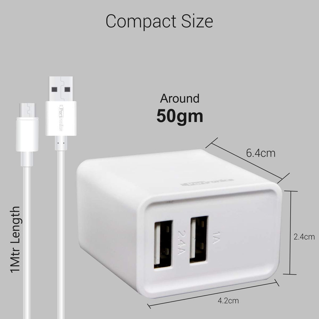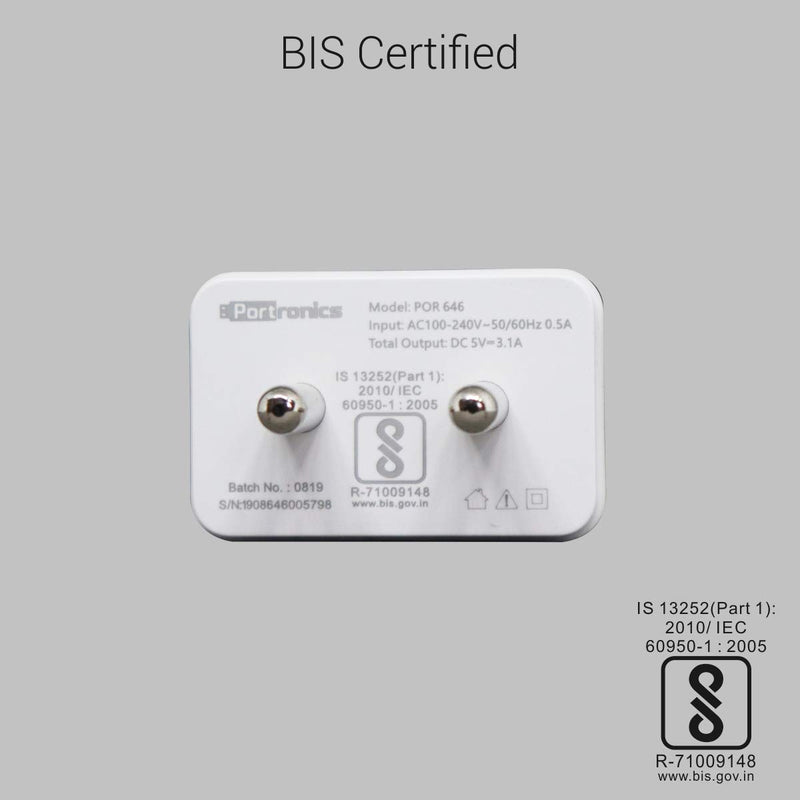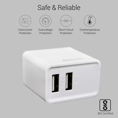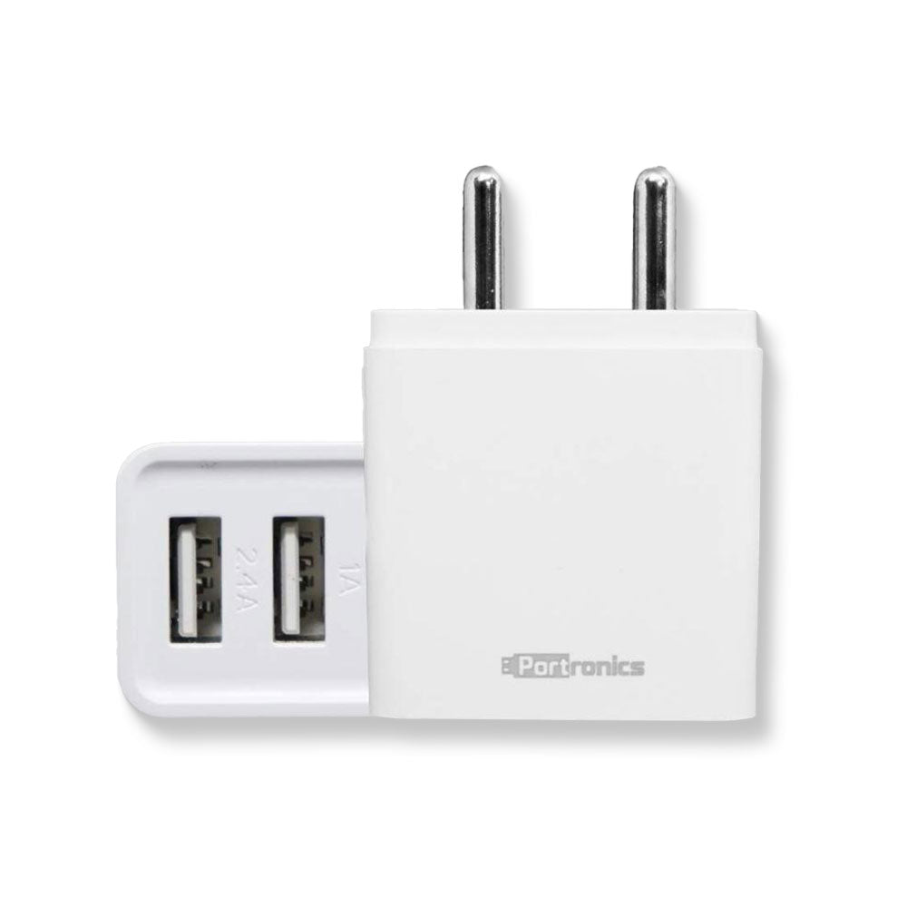 The Portronics Adapto POR-646 3.1A Dual Port Adapter is slim, compact and lightweight body takes up minimal space and looks elegant. This adaptor converts normal AC 100-240V-50/60Hz input to DC 5V-3.1A Dual USB output. It auto detects the connected device's ratings and charges it at fastest possible speed for that device. It protects your device from over-heating, over-current and over-charging.