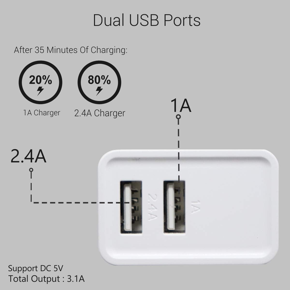 - It has dual USB ports, adapter converts normal AC input to dual USB outputs DC 5V-3.1A. It protects your device from over-heating, over-current and over-charging.