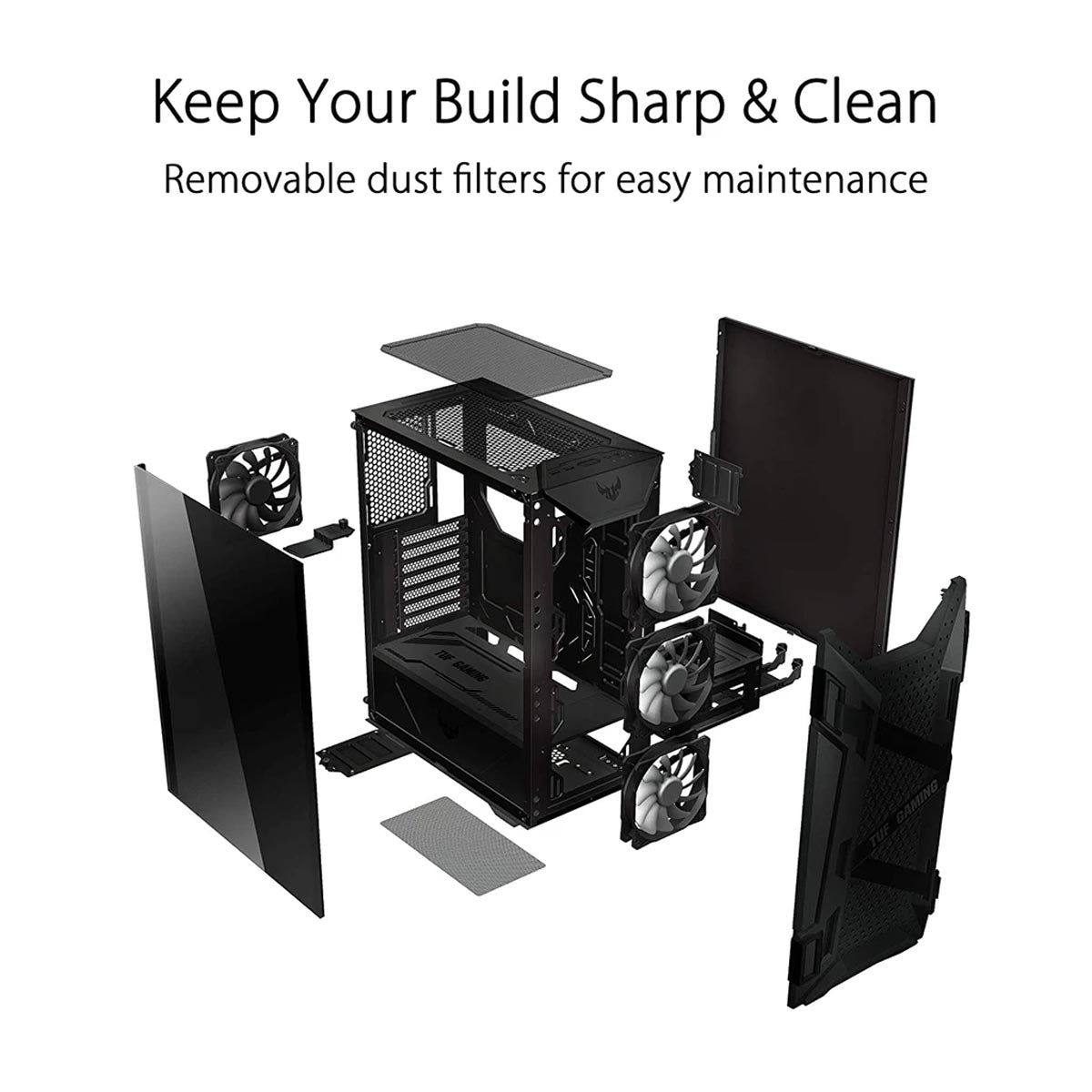 - Cabinet & PSU: All these units mounted on ASUS TUF GT301 Mid-Tower Cabinet, which comes with 3 Pre-Installed 120mm ARGB Fans, 2x USB 3.2 Ports, Dust Filters and more. Your PC is powered with ASUS ROG Strix 650W 80 Plus Gold Certified SMPS which have a smart controller to control the fans based on work load.