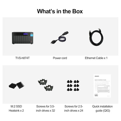 | Package Contents | TVS-h874T Ethernet Cable x 1 Power Cord x 1 Flat head screw x 32 (for 3.5" HDD) Flat head screw x 24 (for 2.5" HDD) M.2 SSD Heatsink x 2 Quick Installation Guide (QIG) |