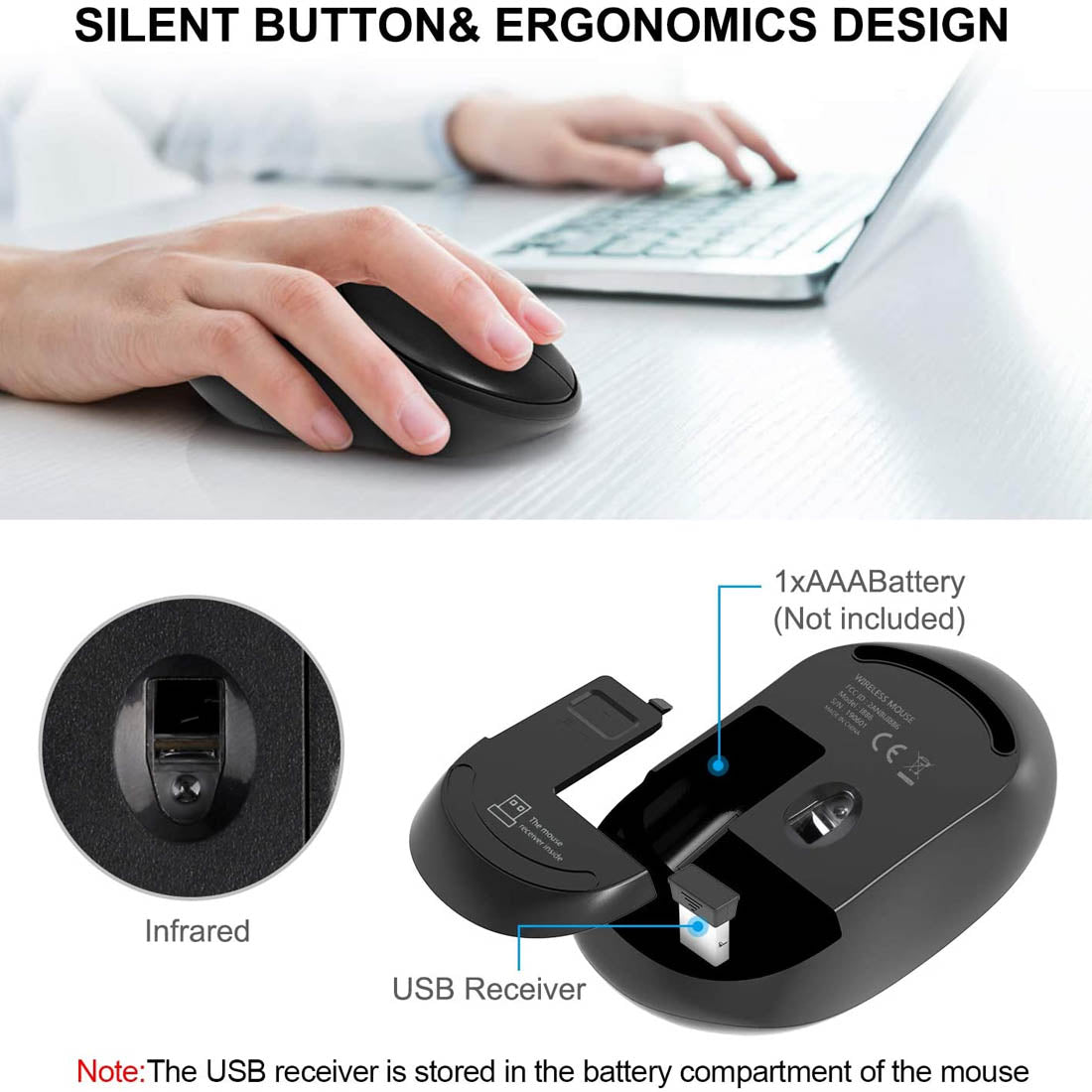 - 2.4GHz wireless technology provides more stable connection and gives effective wireless range up to 32.8 ft. The USB receiver is connected to the battery compartment of the mouse. Connect a keyboard and mouse with just one nano receiver.Silent buttons let you enjoy convenience, smooth typing and clicking. Hotkeys provide easy access to multimedia controls and applications.