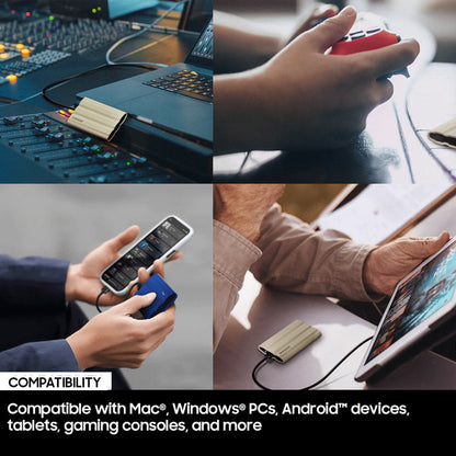 - This Samsung T7 SSD is the storage device that works with most everything PC, Mac, Android devices, gaming consoles and more.