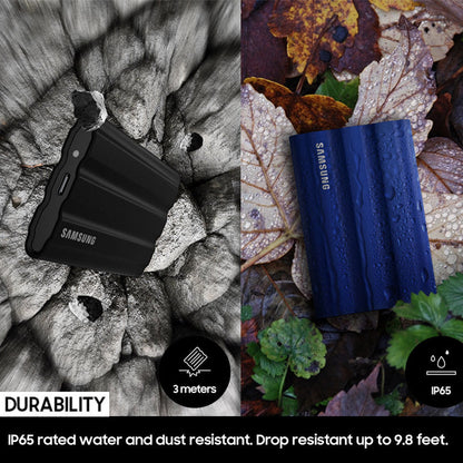 - T7 Shield is manufactured to be durable, rugged, and compact with an IP65 rating. The rugged design and advanced outer elastomer add extra durability to even endure a 9.8-foot drop.