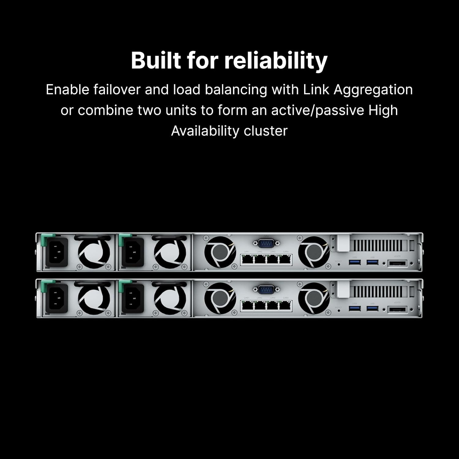 RS822RP+ comes with four Gigabit RJ-45 ports which can be bonded with Link Aggregation to enable automatic network failover and load balancing.