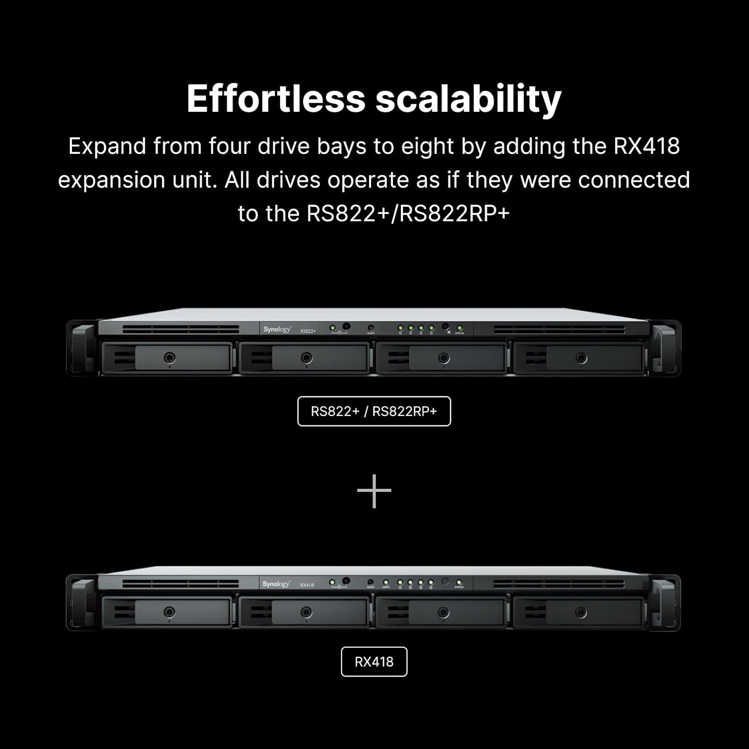 The compact 1U 4-bay Synology RackStation RS822RP+/RS822+ with its storage and connectivity expandability coupled with the powerful Synology DiskStation Manager (DSM) operating system is an ideal edge storage solution for branch offices and small and medium-sized businesses.
