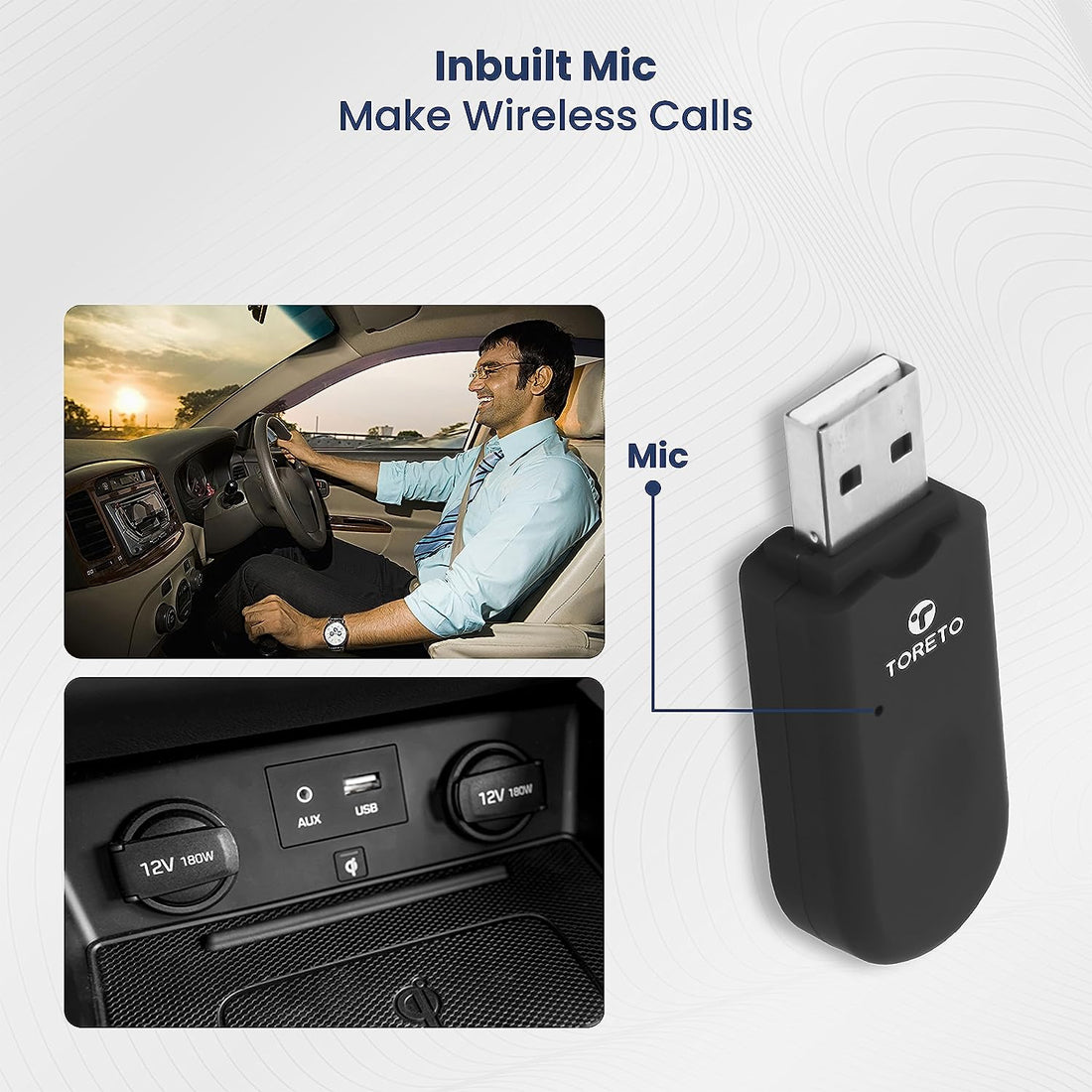 Toreto TOR-651 Bind USB Bluetooth Receiver For Handsfree Calls with 10X Larger in-built Mic, 3.5mm Aux Jack Adapter