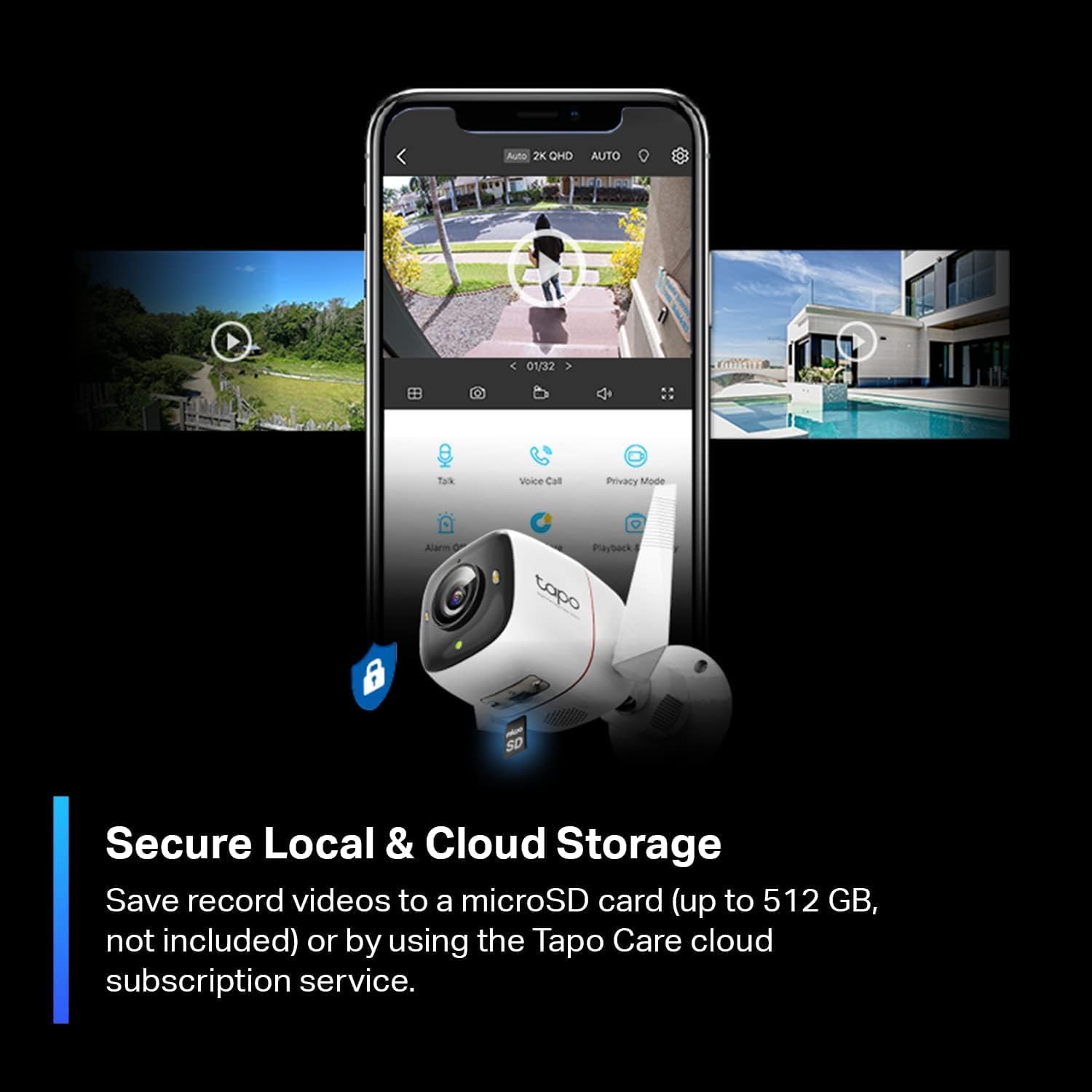 Flexible Storage Options: The camera offers versatile storage solutions to meet different needs. It supports local storage via a microSD card with a capacity of up to 512 GB, allowing you to store footage directly on the device. Additionally, it offers cloud storage through Tapo Care services, providing a secure and convenient way to access your recordings from anywhere.