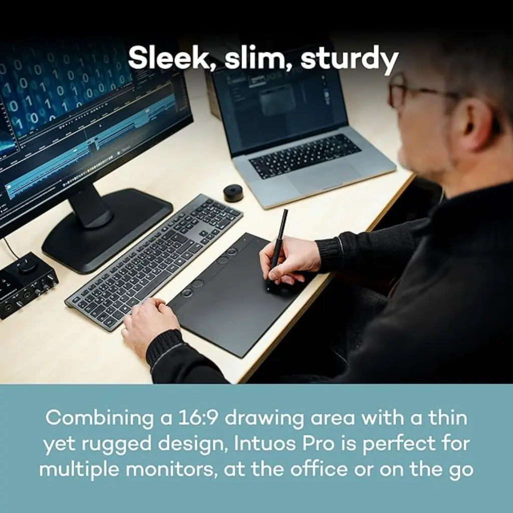 The Wacom Intuos Pro Small PTK470K0C is a premium Bluetooth graphic drawing tablet designed for artists, designers and digital creators seeking precision and portability. Featuring the advanced Pro Pen 3 with 8192 pressure levels, intuitive ExpressKeys and a customizable dial, it delivers smooth workflow control. Its compact, ultra‑thin magnesium build makes it ideal for studio or on‑the‑go use, offering exceptional performance for illustration, editing, animation and professional creative tasks.