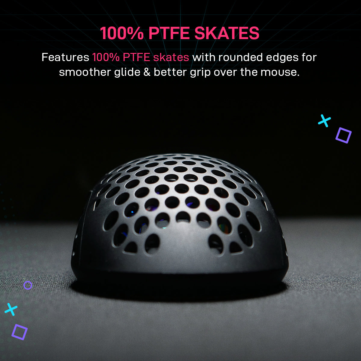 - The M42 features 100 % PTFE skates with rounded edges for smoother glide, while its matte UV coating in combination with the whole structure make for a steadier grip. Enhancing airflow under your palm, the holes also help you stay comfortable.
